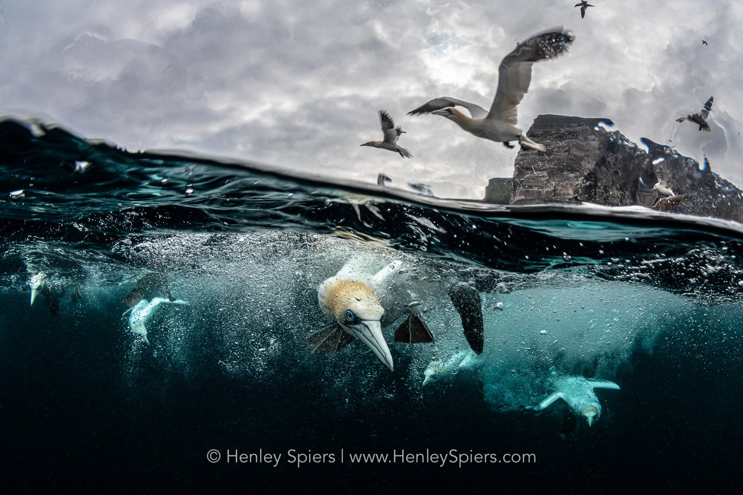 The barrage of diving gannets is electrifying, streams of bubbles erupt behind as they torpedo into the water with pointed beaks and open eyes. These handsome seabirds are just as agile in the water as out, reacting incredibly quickly to one another amidst the organised chaos of the hunt. Their white bodies perfectly contrast with the dark waters beneath the cliffs, and the resulting pictures cannot fail but impress.